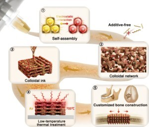 Die chinesischen Forscher haben den Schmelzpunkt auf andere Weise gesenkt. Sie kombinierten Siliziumdioxid mit Kalzium- und Phosphat-Ionen, die dafür bekannt sind, das Wachstum von Knochenzellen anzuregen. Es entstand ein Gel, das sich drucken lässt. Anschließend wird es bei einer relativ geringen Temperatur von 700 Grad Celsius ausgehärtet.