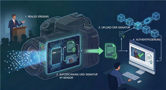 - Werden die Signaturen in ein öffentliches Register (z.B. eine Blockchain) hochgeladen, können alle die Authentizität von Videos und anderen Daten überprüfen.