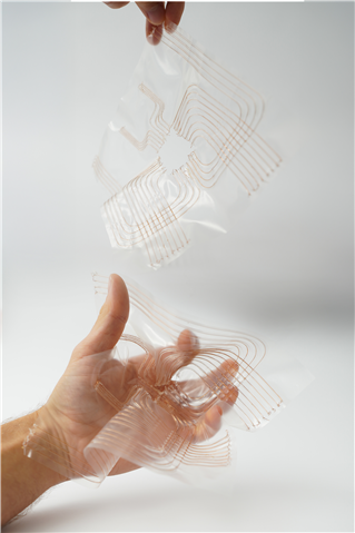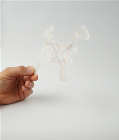 Hochflexible, dehnbare und 3D-formbare Platinen – WEAM-Aufdruck einer Kupferleitung mit 0,1 mm Durchmesser auf einer 0,1 mm dünnen thermoplastischen Polyurethan-Folie. [© Fraunhofer IWU]
