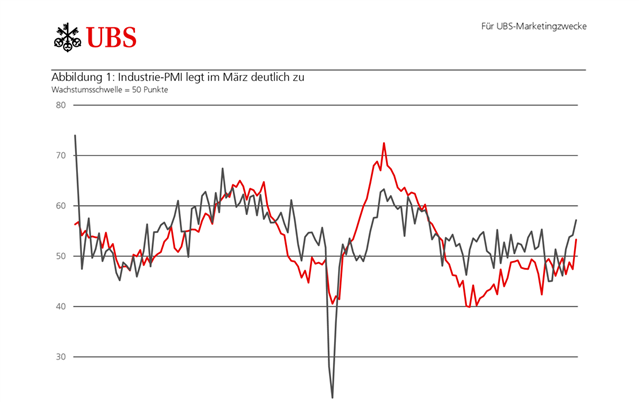 Der procure.ch Einkaufsmanagerindex (PMI) legte im März um 5,9 Punkte auf 53,3 zu und notiert erstmals seit Dezember 2022 wieder über der Wachstumsschwelle von 50 Punkten. In den USA und in der Eurozone waren die Industrie-PMIs in den letzten beiden Monaten ebenfalls von einer positiveren Dynamik geprägt, die sich laut dem Flash PMI für die Eurozone auch im März fortsetzen dürfte. Die Verbesserung im Schweizer PMI ist unter anderem auf gestiegene Lieferfristen zurückzuführen, die üblicherweise eine höhere Nachfrage widerspiegeln und daher positiv in den Indikator einfliessen. Angesichts des Konflikts im Nahen Osten dürften die längeren Lieferfristen jedoch eher durch Störungen in den Lieferketten bedingt sein. Würde man den Gesamtindikator ohne die Lieferfristen berechnen, also ausschliesslich anhand der übrigen vier Subkomponenten, läge er zwar leicht tiefer, aber mit 51,5 Punkten immer noch über der Wachstumsschwelle.Konzept des PMI