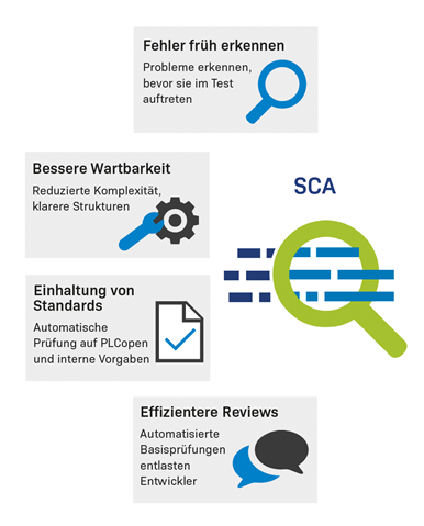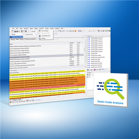 Dazu analysiert eine Vielzahl an unterschiedlichen, gleichzeitig laufenden Prüfregeln die verschiedensten Aspekte des Steuerungscodes und identifiziert eventuelle Qualitätsmängel, nicht eingehaltene Richtlinien oder Verstöße gegen interne Codierungsstandards frühzeitig.