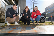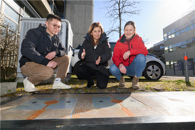 Parken und automatisch „tanken“: Weizhou Ye, Nejila Parspour und Fides Faber checken die Ladeinfrastruktur. [© Universität Stuttgart / Jan Potente]