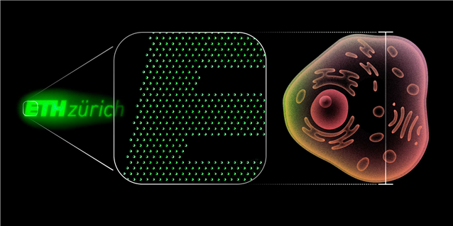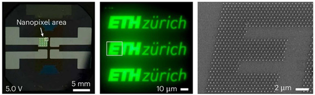 Pixel im Grössenbereich von 100 bis 200 Nanometer legen zum einen die Grundlage für ultrahochauflösende Bildschirme, die etwa in Brillen nahe am Auge gestochen scharfe Bilder zeigen könnten. Um das zu veranschaulichen haben die Forschenden um Shih das Logo der ETH Zürich dargestellt. Dieses ETH-Logo besteht aus 2800 Nano-OLED und ist ähnlich gross wie eine menschliche Zelle. Jedes seiner Pixel misst rund 200 Nanometer (0.2 Mikrometer). Die bisher kleinsten Pixel der ETH-Forschenden erreichen den Bereich von 100 Nanometern.
