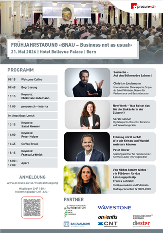 Am 21. Mai 2026 trifft sich die Schweizer Einkaufs- und Beschaffungsbranche im Bellevue Palace Bern zur Frühjahrstagung von procure.ch. Unter dem Motto «Business not as usual» erwarten Sie inspirierende Keynotes von renommierten Persönlichkeiten wie Christian Lindemann, Sarah Genner, Peter Holzer und Franca Lehfeldt. Freuen Sie sich auf neue Impulse zu Performance, Führung, Digitalisierung und Zukunft der Arbeit – speziell für Einkäufer/innen.