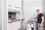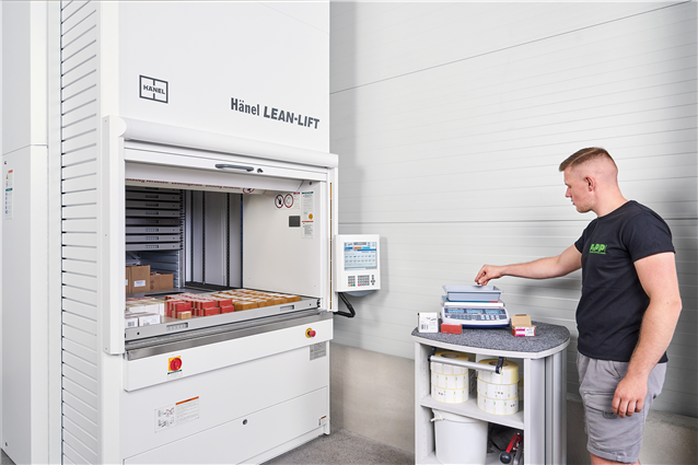Auch im Bereich der Kommissionierung überzeugt die Hänel Lösung mit durchdachter Technik: Eine Zählwaage direkt am Lift erfasst Schüttgut präzise, die Menge wird automatisch bestimmt und das Material unmittelbar für die Montage bereitgestellt. Ein Etikettendrucker unterstützt zusätzlich bei der Kennzeichnung der Teile.