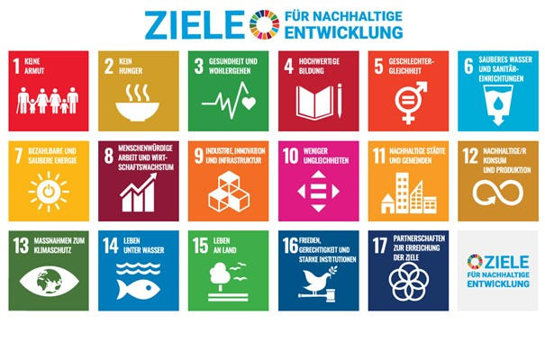 Übersicht der 17 UN-Nachhaltigkeitsziele – farbige Icons zu Umwelt, Gesellschaft und Wirtschaft als Grundlage nachhaltiger Unternehmensstrategien.