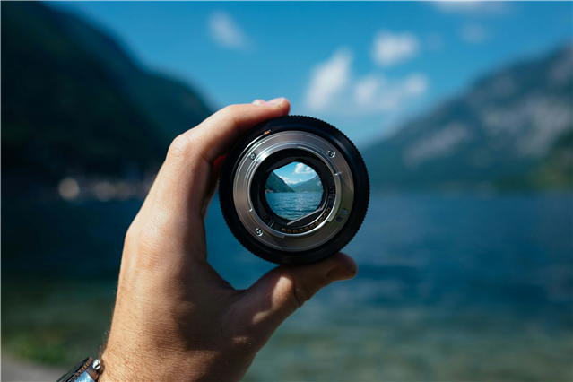 Hand hält eine Kameralinse mit Blick auf Berge und See – Symbol für Klarheit, Fokus und strategische Ausrichtung im Unternehmen.